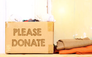 clothes in carton box on wood table for donation, coat drive concept, please donate text